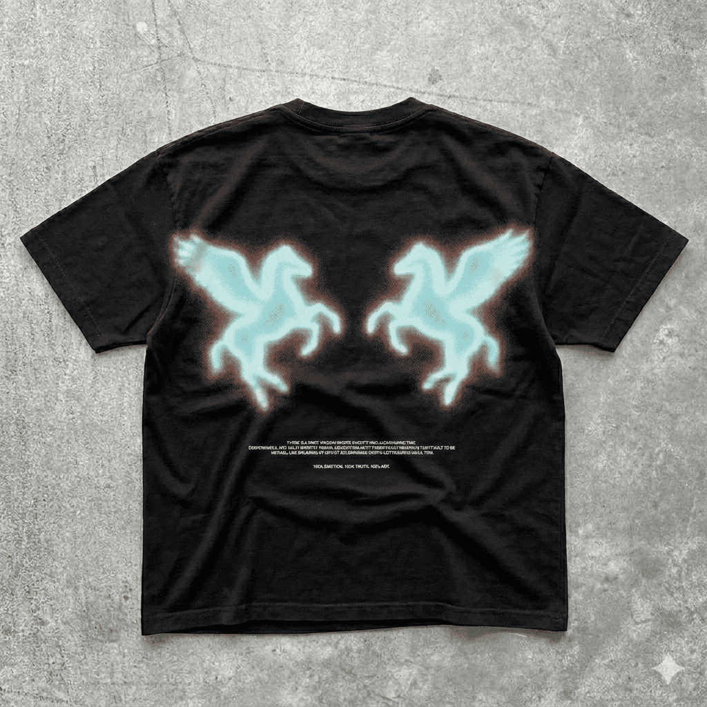 Deep black premium cotton, oversized boxy silhouette. Luminous artwork